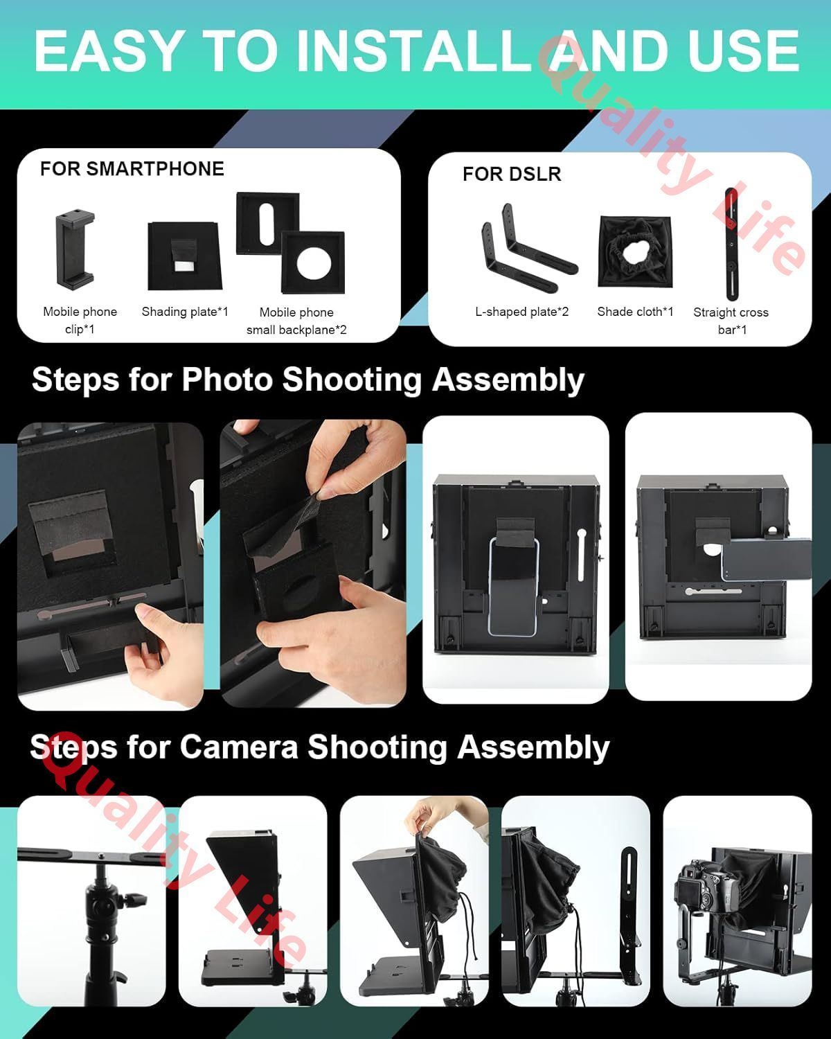 【万能&多機能】このテレプロンプターはデジタル一眼レフ、携帯電話、iPad/タブレットに対応しており、三脚、リングライト、マイク、1つは多目的に使用できます。