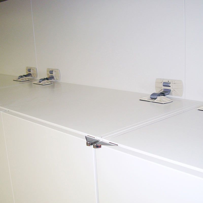 ●ベルトの両端に取り付けられた接着パッド付きベースの一方をキャビネット天板に、もう一方を壁面に接着固定して使用します。