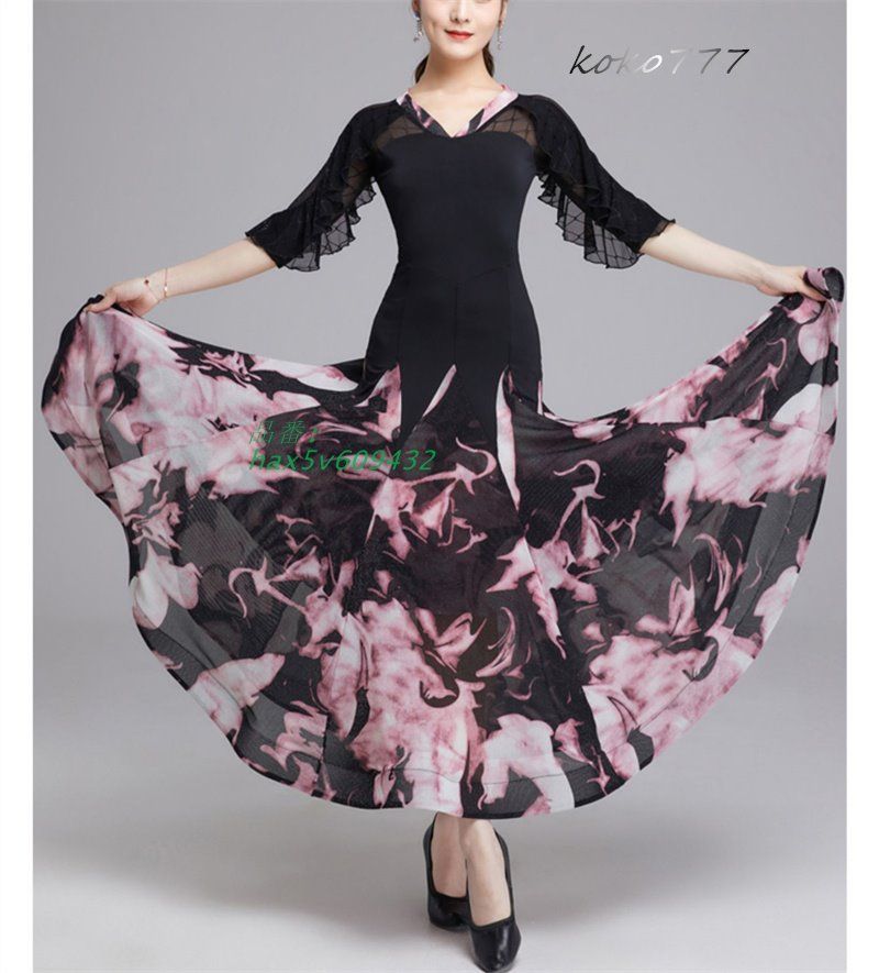 ロングドレス レディース ワンピース ラテンダンス フリル 花柄 公演 部活 舞台衣装 洋服 発表会 ワルツ 社交ダンス モダンダンス パーティー ナショナルダンス hax 5 v 609432