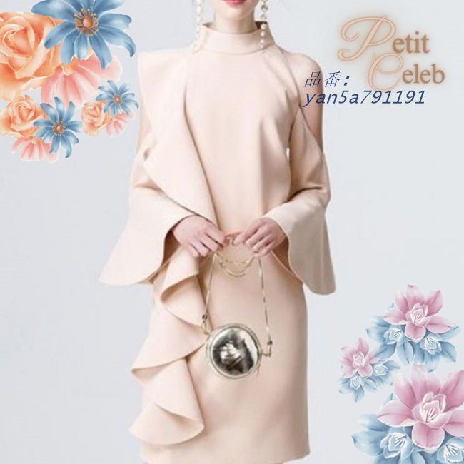 パーティードレス 結婚式 ドレス ワンピース 母親 親族 フォーマルドレス ピンクベージュ 肩見せ フリル ラッフル パフスリーブ タイト フレア 長袖 ウエディング ワンピ セクシー クール レトロ 成人式 花嫁 二次会 レディース ブライダル お嬢様 お呼ばれ 食事会