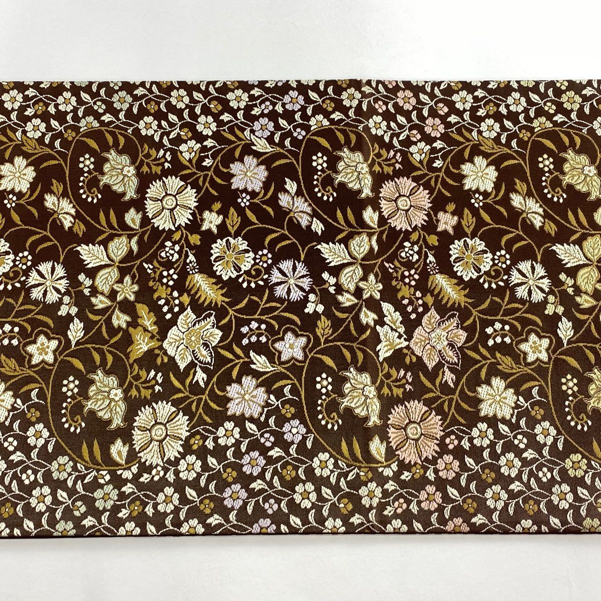 袋帯 箔屋清兵衛 落款 正絹錦織 花唐草 箔 焦茶色 六通 正絹