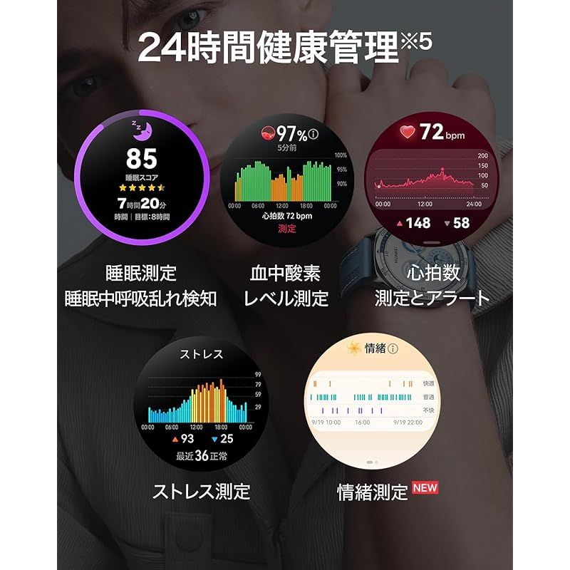 【24時間健康管理】 睡眠中呼吸乱れ検知、心拍数、血中酸素レベル、ストレスの測定に加え、新たに情緒をリアルタイムに測定する機能を追加。長時間不快が続く際は、呼吸エクササイズの提案通知により気分転換を手助けします。
