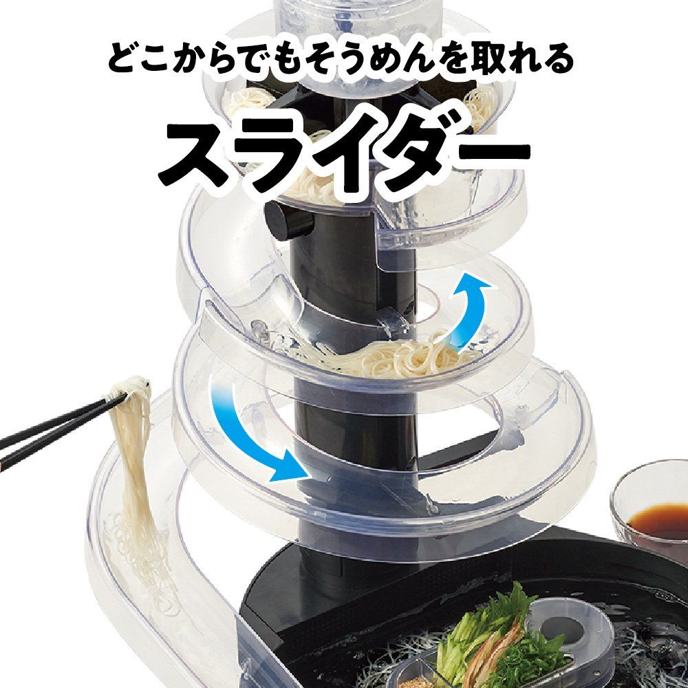 サイズ(約):幅47×奥行き35.5×高さ55cm/重量:2100g家で楽しむ、流しそうめん。コンパクトなタワー型。ご家庭の食卓で流しそうめんが楽しめます。単2形アルカリ乾電池専用4本使用(別売り)保証期間:お買上げの日から本体6ヵ月間
