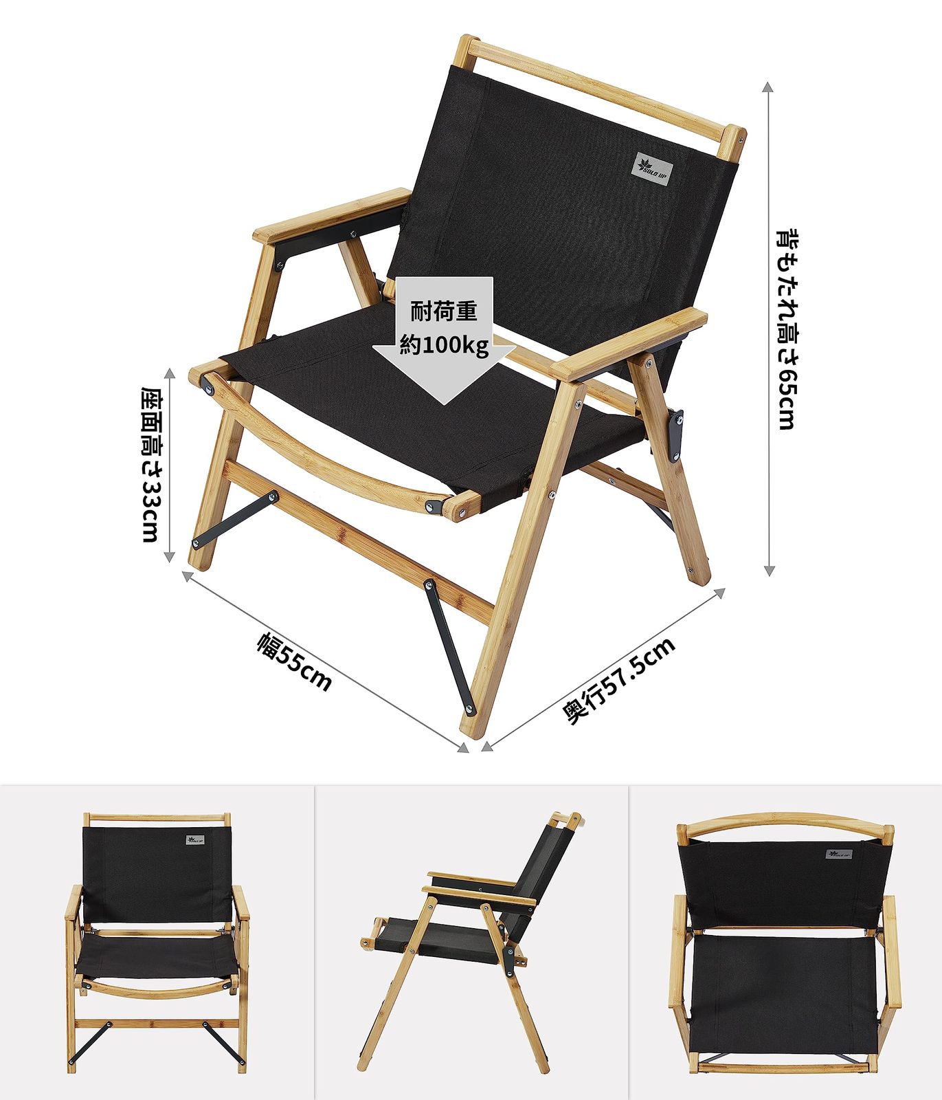 【仕様】:材質:シート/オックスフォード生地 フレーム/竹。 展開サイズ(約):65(h)×55×57.5cm 収納サイズ(約):56×9.5×61(h)cm 重量(約):3.4kg 耐荷重(約):130kg。
