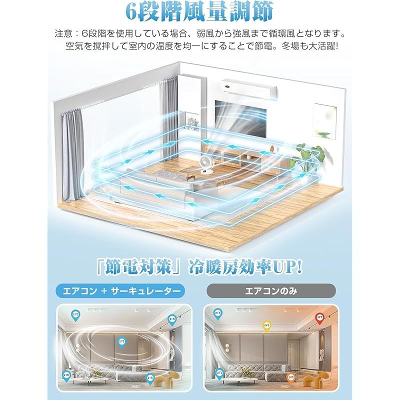 ??【6段階風量&超静音モーター】2025年に新発売するサーキュレーターは、業界先進のデザインを採用し、完全に大風量と静音の融合を果たしています。柔らかい微風から暑さを吹き飛ばす強風まで使用シーンに合わせ6段階風量調節が可能で、最大風量を使用している場合、弱風から強風まで循環風となります。そして特殊設計の立体羽根は、運転アシストと摩擦を低減し、実用面でも静音性を実現!1段階と6段階の差はあまりにも大きいので、6つの段階に設計して、いつでも自分の必要に応じて調整することができます!