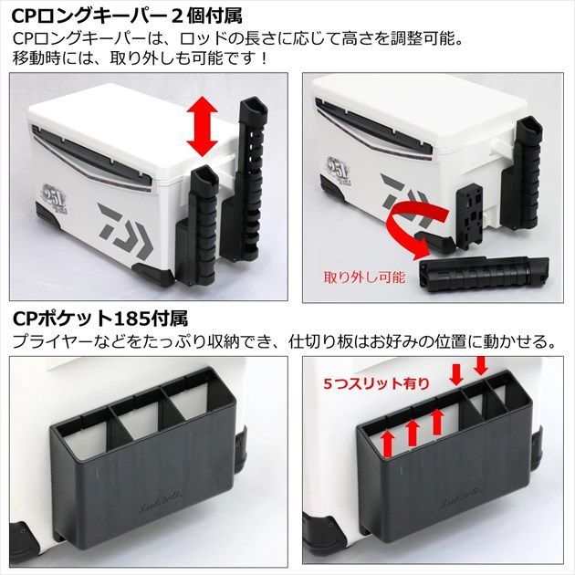タイラバ、ジギング、ハードロックなどゲームフィッシングにピッタリ。ソルトルアー専用クーラーが登場。容量25?、中型の青物やマダイ、ロックフィッシュに最適なサイズ。うれしいラインナップ、高保冷の1面真空仕様と軽量スチロール仕様。グリップの長い竿もしっかり保持できるCPキーパーロングを2個付属。プライヤーやフィッシュグリップなどをたっぷり収納できるCPポケット185付属。船の上などでも滑りにくいふんばるマンを標準装備。90度回すだけで簡単に開閉可能な水栓付き。 ★ 容量:25L 自重:4.3kg 内寸:22×43×22.5cm 外寸:31×58×34cm ※実物と色が違って見える場合があります。あらかじめご了承下さい。