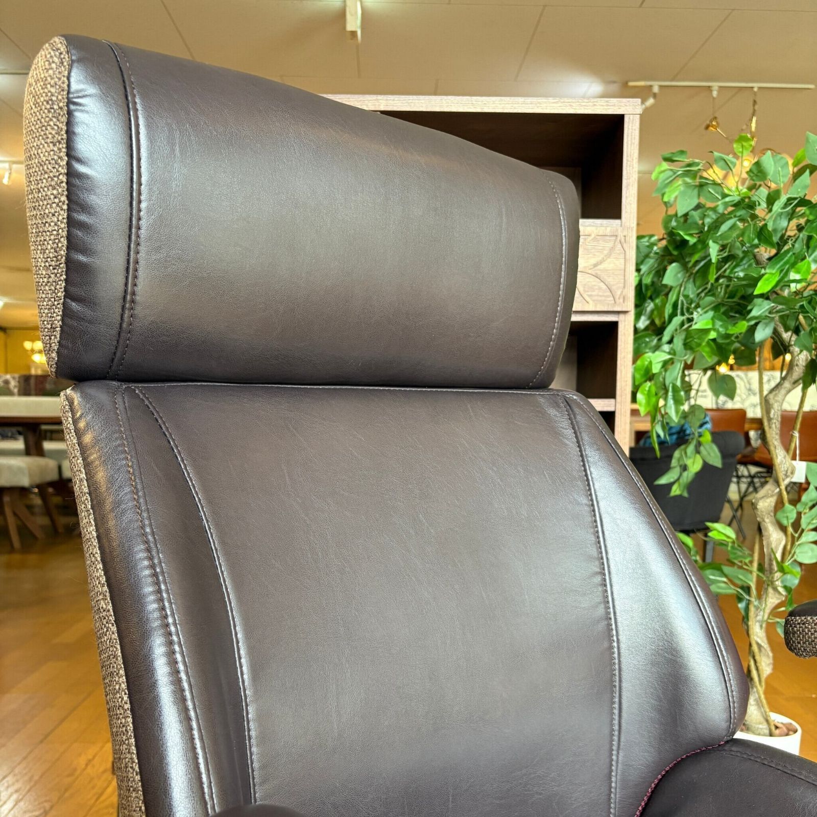ゆったりと座れるワークチェアです。最大の特徴はPU(ポリウレタンレザー)と麻のような見た目のコットンを組み合わせています。斬新でありながらもどこか懐かしようなデザインで、現代的なデザインのデスクからヴィンテージ・アンティーク系のものまで、どちらにも合わせやすいかと思います。