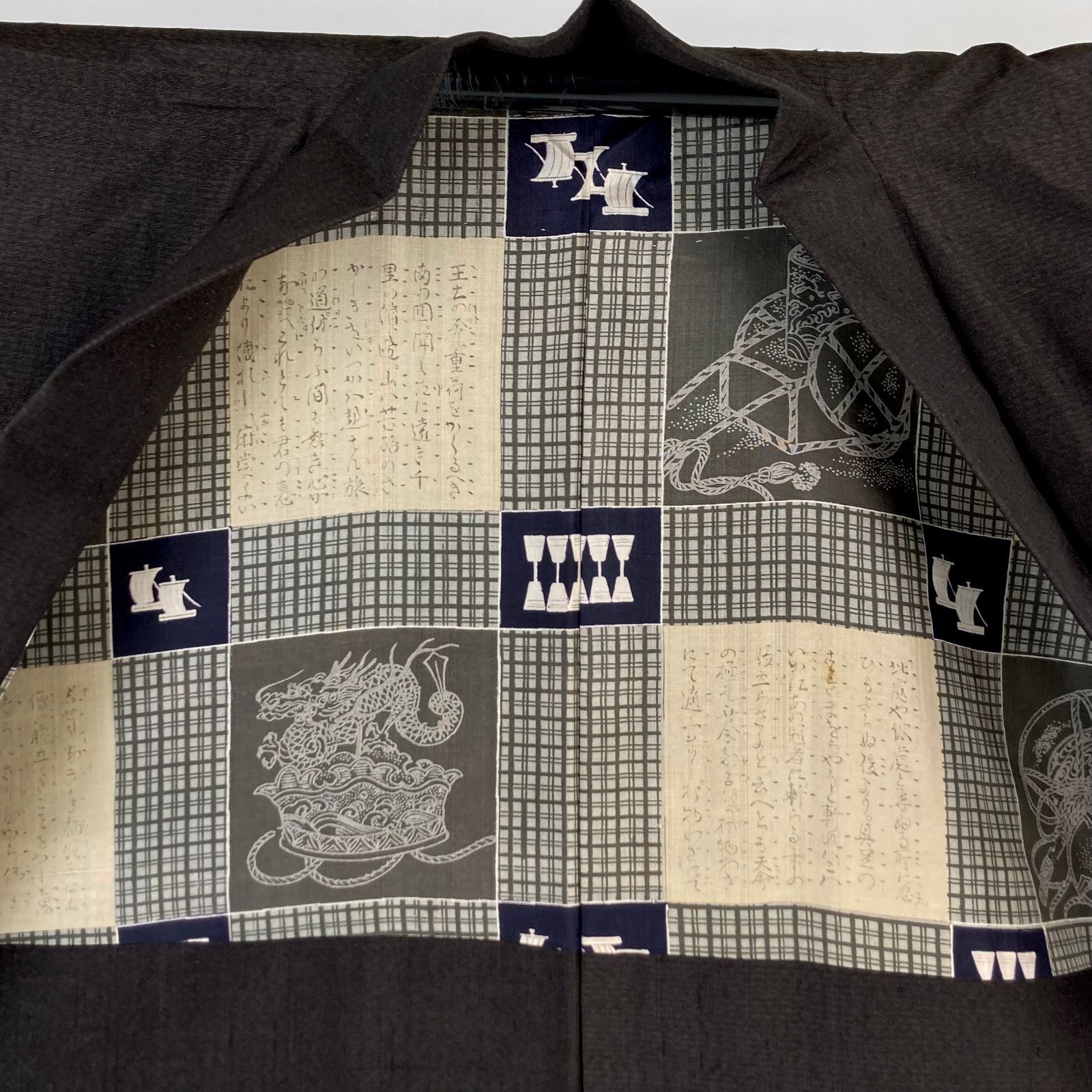 たんす屋 メンズリユース着物 羽織 こげ茶 紬 横縞 洒落羽裏 笛 鼓 誰が袖 袷 身丈 78 cm 裄丈 64