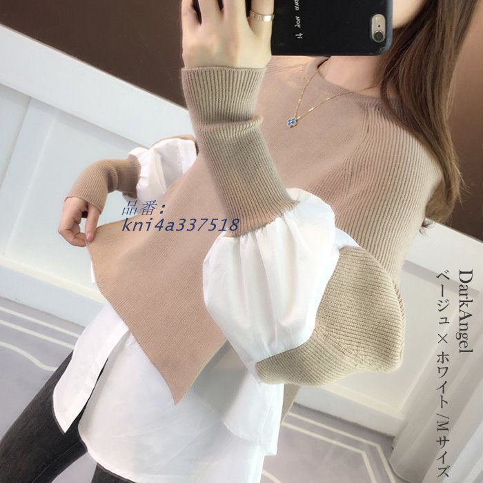 トップス 異素材 切り替え ニット セーター 長袖 レイヤード風 ドッキング 重ね着風 おすすめ レディース オシャレ トレンド 。 プチプラ 韓国 オフィス カジュアル きれいめ