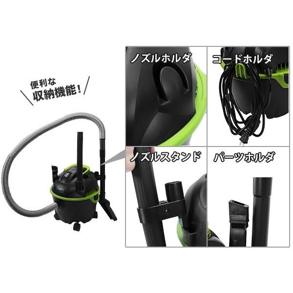 3種類のノズルが付属しており、木くず・砂利・ホコリ等の乾いたゴミや液体の吸引、ガレージ・車内・ビル・倉庫など様々な用途にご使用いただけます。※微粉塵・油や水の汲み上げはできません。