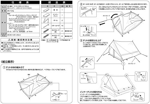 材質:幕体/ウォールポリエステルリップストップ210T(PU2,000mm)UV加工・撥水加工、メッシュポリエステルノーシームメッシュ、フロアポリエステルOXF210D(PU3,000mm)、インナーテント/ウォールポリエステル185T(通気性撥水加工)、メッシュポリエステルノーシームメッシュ、フロアポリエステルOXF150D(PU1,000mm)、ポール/スチール(粉体塗装)Φ19mm、原産国:中国