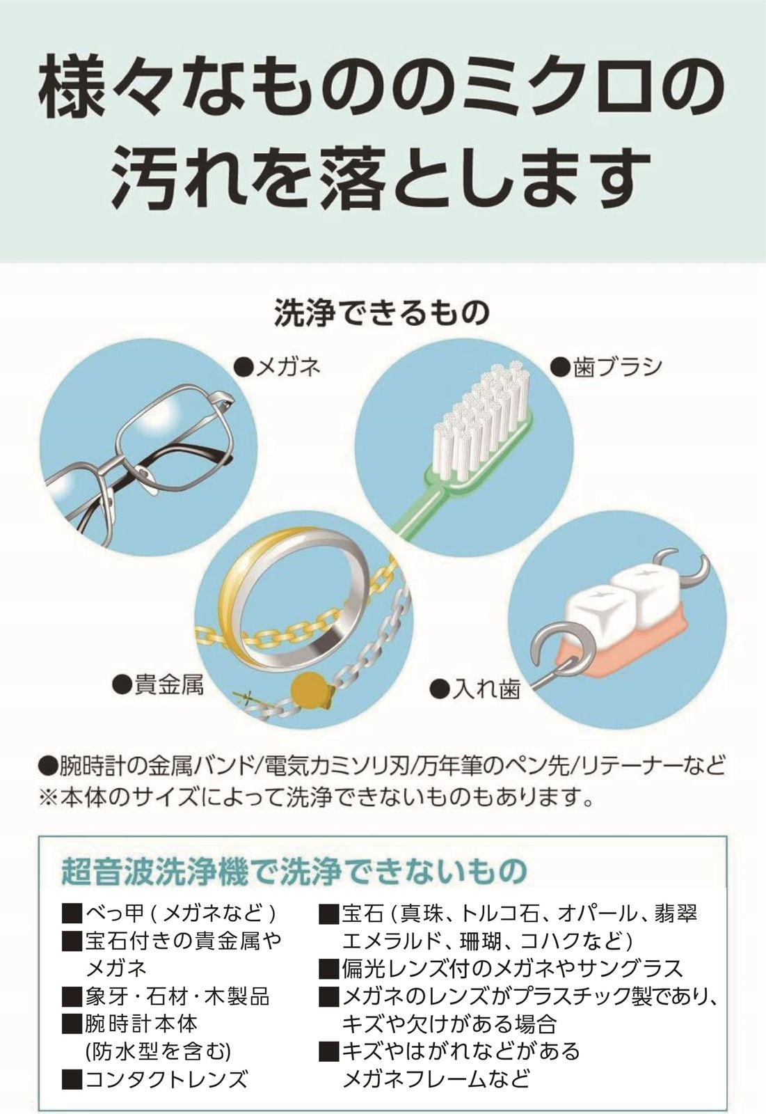 【様々なもののミクロの汚れを洗浄】メガネ・貴金属・歯ブラシ・リテーナー・入れ歯・腕時計の金属バンド・電気カミソリ刃・万年筆のペン先、など色々なものに対応しています。