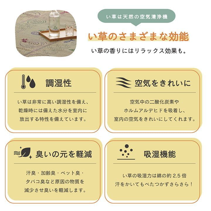 人気の猫と夏の定番の金魚をデザインしたい草ラグです。コンパクトに三つ折りで畳めて省スペースにも収納できます。い草には空気の自然浄化作用、湿度の調節作用などがあります。い草にヒバエッセンス加工を施しています(抗菌防臭効果)。青森県のヒバの木から抽出した「ヒバ油」をメーカー独自の技術で商品に加工しました。「ヒバ油」には、ヒノキチオールという天然物質としては極めて抗菌性の高い成分が含まれ、医療や食品など多分野で利用研究が進められています。裏は滑り止め不織布付きで、滑る心配がありません。