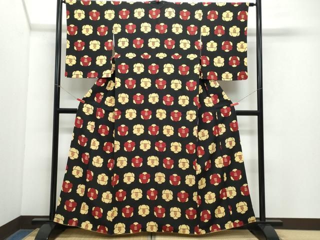 平和屋着物 上質な小紋 型染め 椿 黒地 鬼しぼ縮緬 正絹 vf