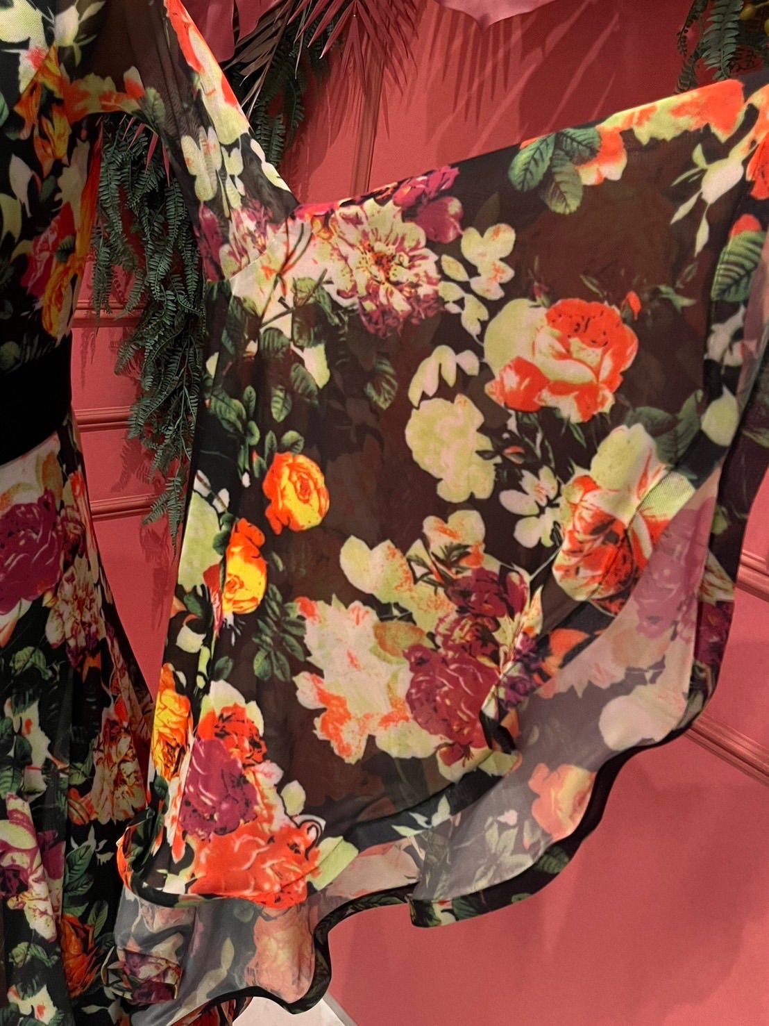 黒を基調とした背景に、色とりどりの大輪の花が咲き乱れ、存在感を放ちます?