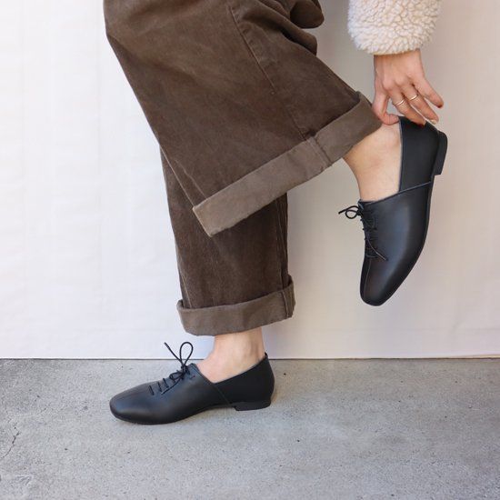 レースアップシューズはトラッドになりがちですが、スクエアトゥとセンターシームですっきり可愛い印象。