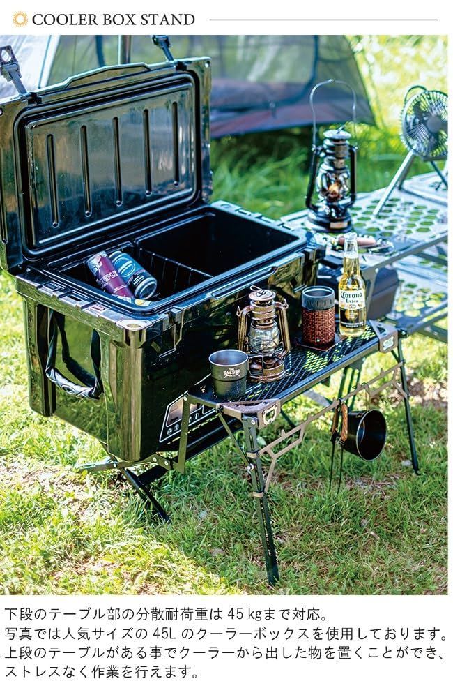 マルチスタンドに新たにワイド&ラギッドモデルが登場。下段のテーブル部の分散耐荷重は45Kgまで対応。人気サイズの45Lのクーラーボックスを置くことも可能。上段のテーブルがあることでクーラーから出したものを置くことができ、ストレスなく作業を行えます。また、ソロのメインテーブルとしても使うことが可能。2段のテーブルが使い勝手抜群。テーブルスタイル、スタンドスタイルでもシェラカップやトングをかけることが出来るハンガーを装備。上段テーブルには忘れがちな栓抜きが本体サイドに付いているので、いざという時に便利です。高46cm×横58.5cm×厚み7cmのきれいに収まる収納機構で薄型・コンパクト・持ち運びも簡単。