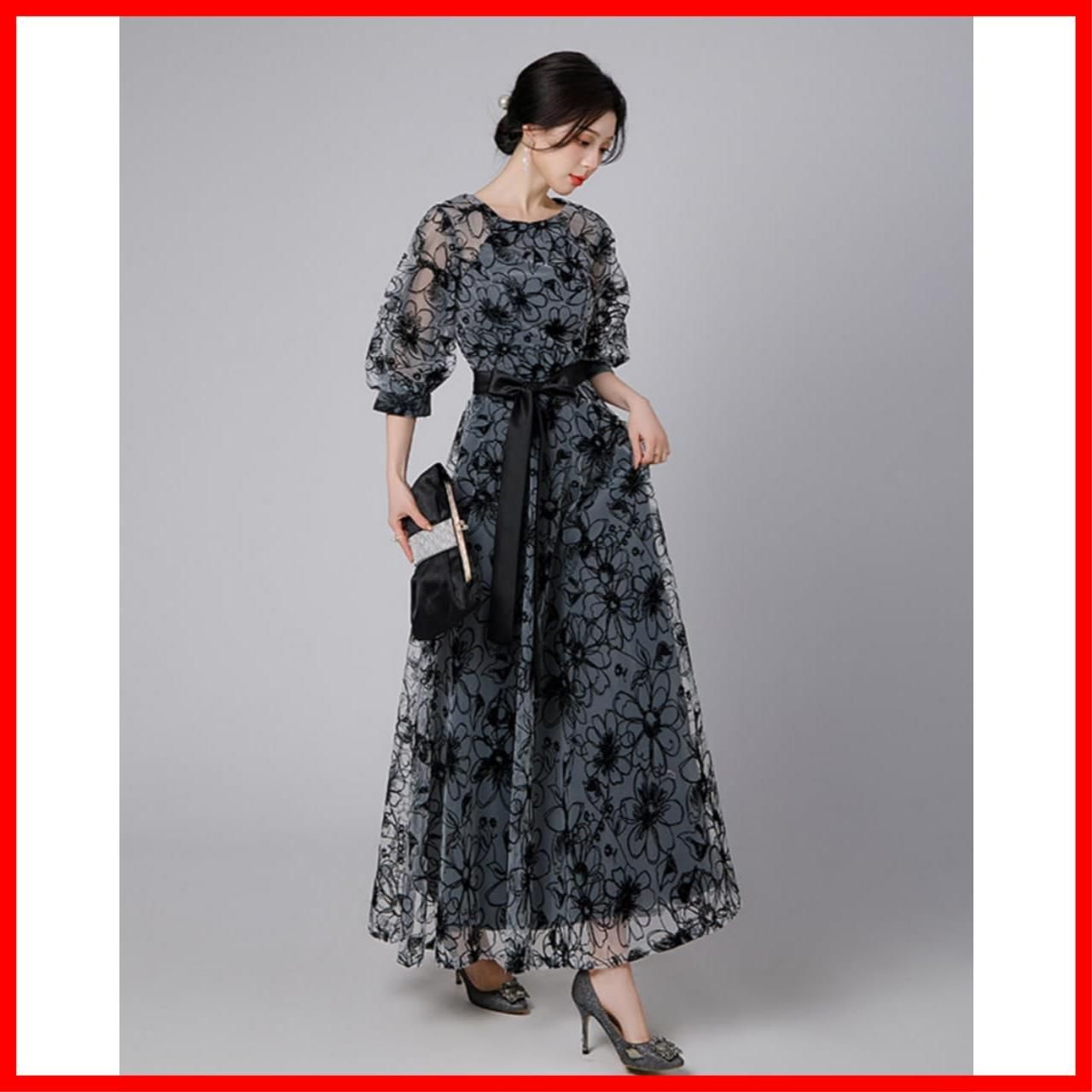 [大人かわいいデザイン] 上品なロング丈のおしゃれなパーティーワンピース。 全体に施された花柄刺繍が新鮮でヘルシーな印象に。また脚長効果の高いリボンベルトも付属しています。トップスと袖部分には、シースルーで華やかな席にもぴったりな大人フェミニンなディテール。さり気なく体型カバーを叶え、優しい印象を後押ししてくれる技ありデザイン。きちんと感は欲しいけど、地味見えはイヤ、という方にぴったりなオケージョンドレス。