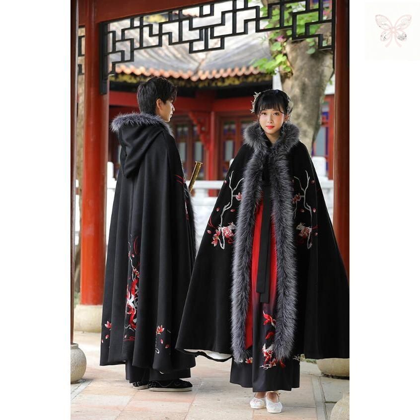 漢服唐装 男女兼用漢服マント 冬 暖かいファーマント メンズ レディース漢服中華服 ロング フード付きファーコート 狐刺繍 豪