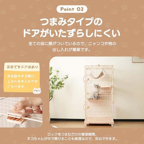 【開きやすいつまみタイプロック】全ての段に扉がついているので、ニャンコや物の出し入れが簡単です。ロックをつまむだけの簡単開閉、ネコちゃんが中で開けることも無理なので、安心できます。