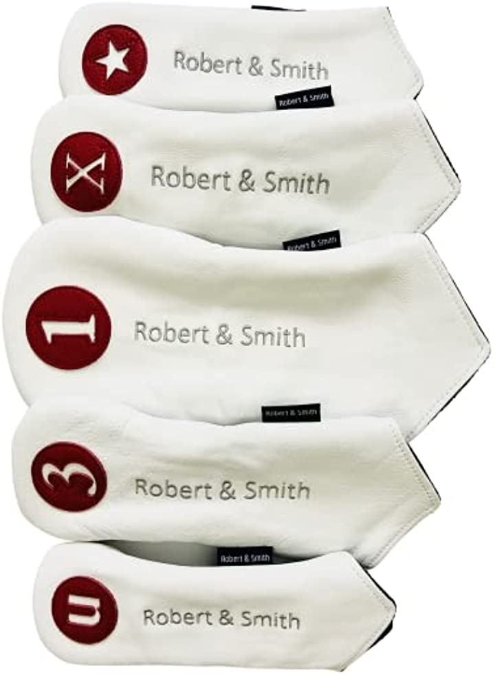 Robert-Smith ゴルフ用品 本革 ヘッドカバー 5点セット ロゴ刺繍 フルグレインレザー ドライバーx 1 ウッドx 2 ユーティリティx ホワイト 赤ナンバー
