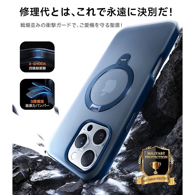 TORRAS iPhone 16 Pro 用 ケース 一体 360°新定点回転スタンド Magsafe対応 Ostand Q 3 Spin 高耐久性 耐衝撃 ゼンマイ式スタンド リング 縦横両対応 マグネット搭載 急速充電対応 指紋防止 ブルー