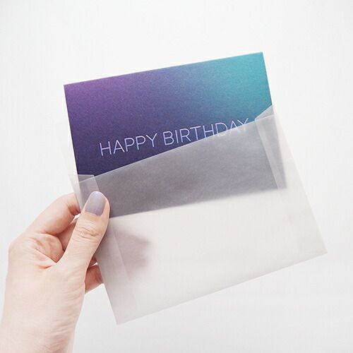 オーロラを思わせる美しいホログラムの箔押しが人気の「NORDLYS」にグリーティングカードが登場です。「HAPPYBIRTHDAY」の文字とカード中面の空にホログラム箔を使っているので、カードを開く動きで光の変化を楽しむことができます。夕暮れから夜明けまでの空をイメージしたグラデーションは、それぞれに時間帯を表すタイトルがつけられています。付属のトレペ封筒に入れると淡く透けてカーテン越しの空のように見えます。【検索ハッシュタグ】#エルコミューン#ノールリス#グリーティングカード#夜明け