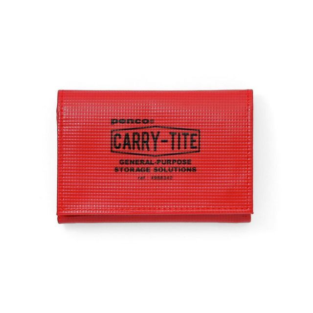 テントやトラックの幌などに使われる丈夫な素材であるターポリンを使用したキャリータイトケース。三つ折りして小銭入れやカードケースになり、二つ折りでやや小ぶりなポーチとしてもお使いいただけます。【検索ハッシュタグ】#ハイタイド#カードケース#カード入れ#キャリータイトケース#ペンコ#レッド#赤