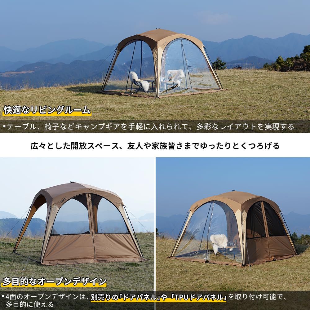 オープンデザイン:テントの四面も完全に開放されており、周囲の景色に親しみやすく、風通しや視野が十分確保でき、友人や家族皆さまでゆったりとくつろげることができます。