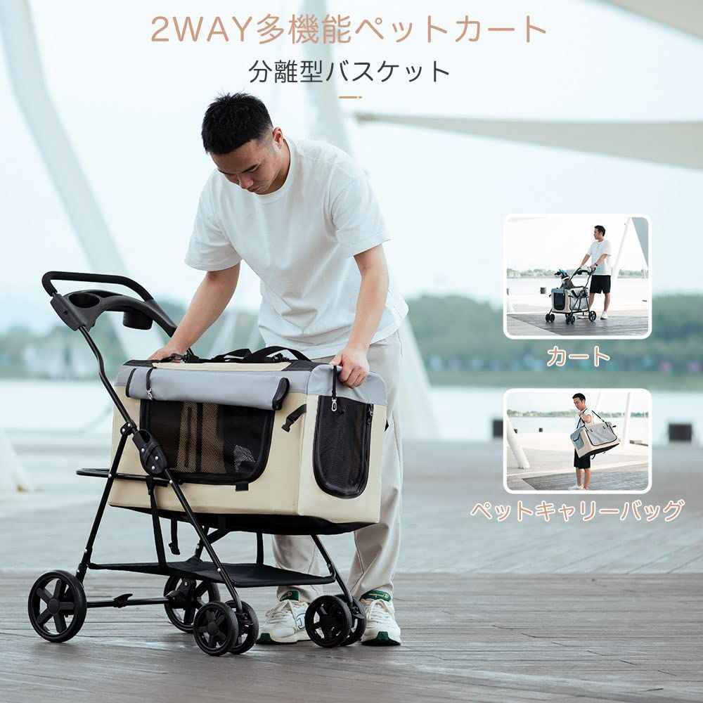 飛び出し防止リード2本付き 後輪ブレーキ付き 前輪360°回転 折りたたみ 耐荷重25 Kg 軽量コンパクト 4輪 カート 組み立て簡単 多頭 猫 小型犬 ベビーカー 中型犬 ベージュ色 バギー 犬 ペットカート Pandaloli