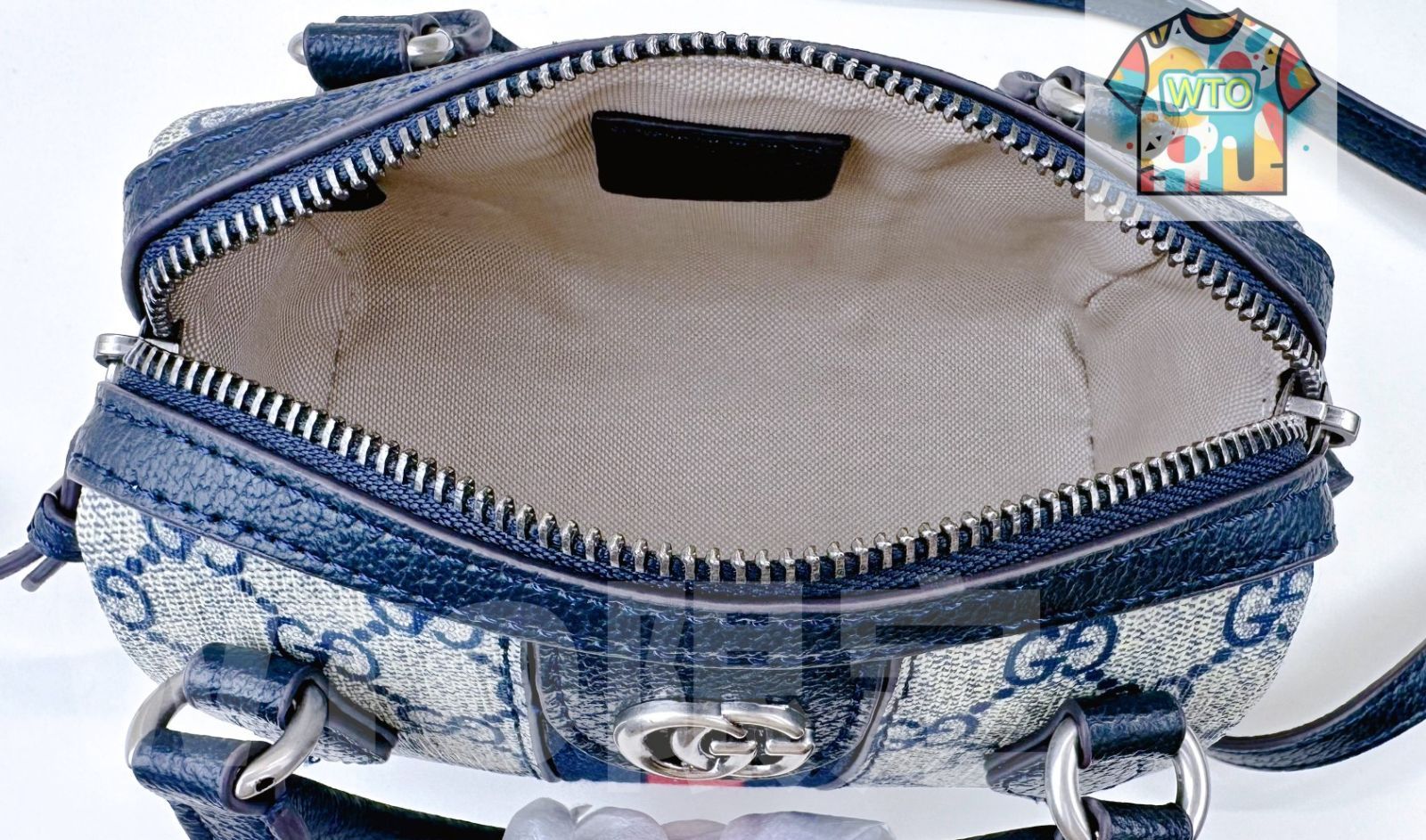 GUCCI の Ophidia シリーズより、スーパーミニサイズのハンドバッグ(型番:781490)をご紹介!サイズは 16.5×10×9cm、重量約 0.3kg で、ブルーの GG Supreme 帆布が印象的な一品です。グレーブルーのレザーエッジと浅金色のアクセサリーが高級感を引き立て、グレーブルーとライトブルーのストライプウェブリボンがデザイン性をアップ。内部は綿麻混紡の裏地にダブル G マークが施され、キーフック付きで使い勝手抜群。革製ハンドル(高さ 4.5cm)と 54cm のショルダーストラップ、ジッパー式の開閉で、iPhone Pro、Airpods、小銭入れ、リップスティックなどの日常小物を快適に収納できます。