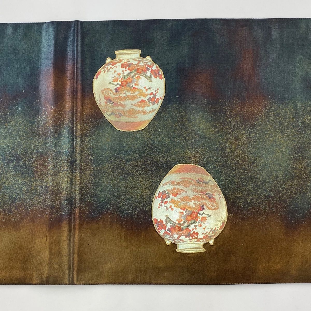 袋帯 秀品 花器 梅 螺鈿 金彩 深緑 お太鼓柄 正絹