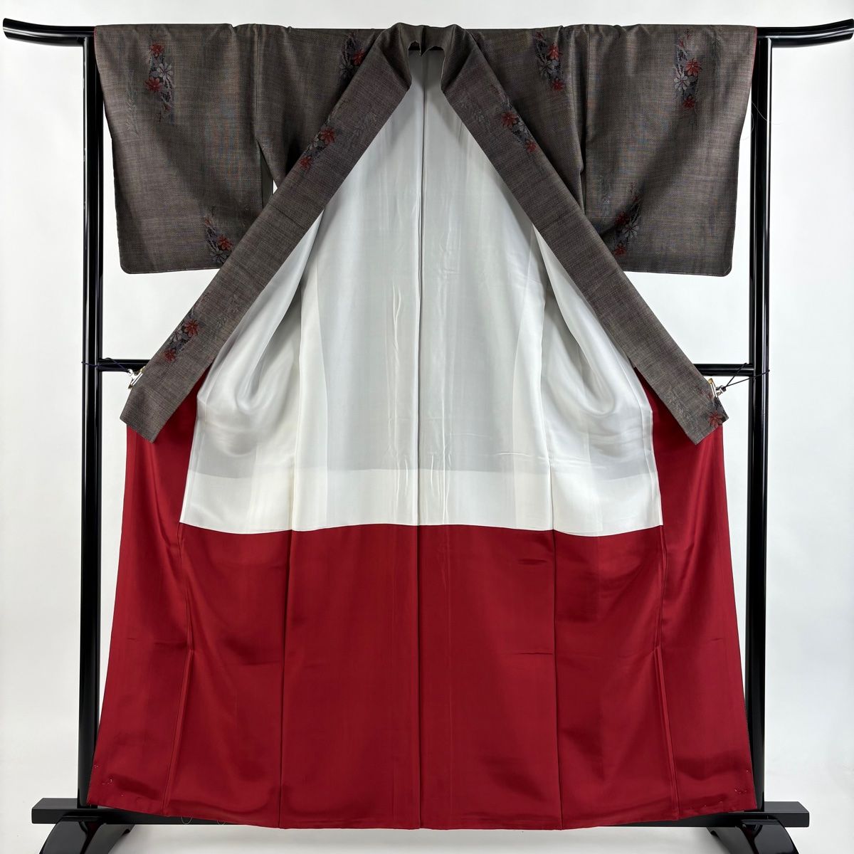 紬 身丈161 cm 裄丈64 M 袷 やまと 草花 シルエット 焦茶色 正絹 秀品