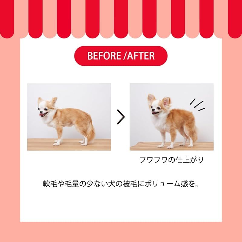 【健康的なボリューム感】軟毛や毛量の少ない犬の被毛に、植物性アミノ酸と天然キトサン、マンゴー種子バター、カカドゥプラムなどを配合し、健康的なボリューム感を実現しました。被毛にハリ・コシ・弾力を与え、しっかりと立ち上がったふんわりとした仕上がりです。プードルのようなカーリーコートから、テリアなどのワイヤーコートの犬種にオススメ。